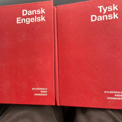 Gyldendal Røde Ordbøger Engelsk-Dansk og Dansk-Engelsk Ordbog. Dansk-Tysk og Tysk-dansk samt retskrivnings ordbog. Bægerne har en rød hardcover, og er en del af Gyldendals Røde Ordbøger serie. 5 ordbøger til 150kr