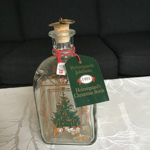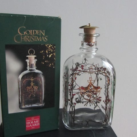 Holmegaard glasflaske med julemotiv dekoration. Flasken er fremstillet i klart glas med malede julemotiver i rød og grøn farve samt detaljer i guld. Flasken har en korkprop med metalring til lukning. Velegnet til opbevaring af væsker eller som dekorativ genstand.