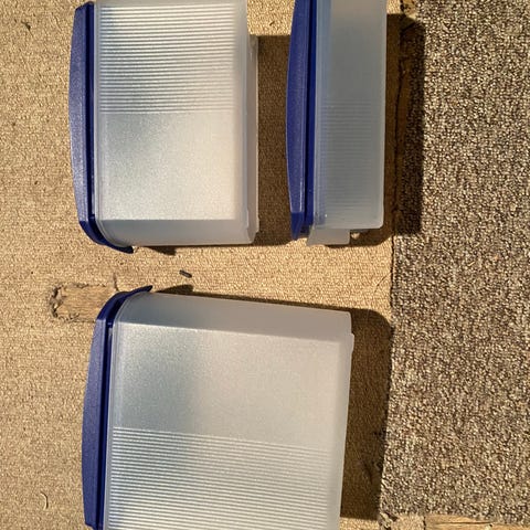 Tupperware skål og opbevaringsbokse i blå glas 1,5 & 0,5 liter. Sættet består af en stor skål med bølget kant og to mindre opbevaringsbokse med låg. Materialet er glas, og farven er blå. Velegnet til opbevaring og servering.