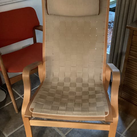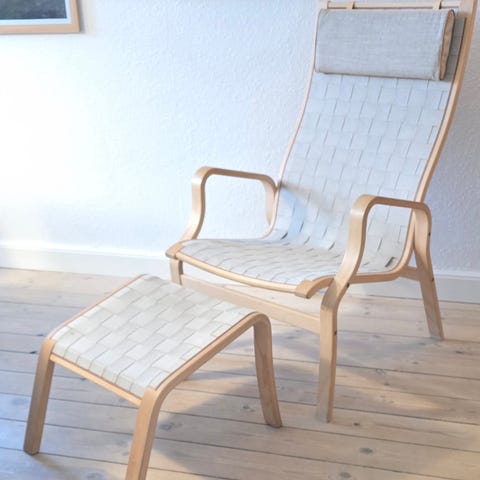 Stel i formbøjet bøg, med lyst gjordeflet og nakkepude.