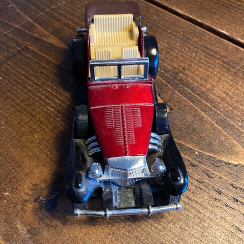 Ægte vintage die-cast modelbil fra slutningen af 1960’erne med detaljeret karrosseri, plastvinduer og åbne døre.