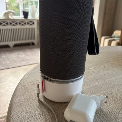 Libertone ZIPP højttaler med rød stofoverflade. Inkluderer strømforsyning og ekstra tilbehør, herunder et gråt stofcover i original emballage.
