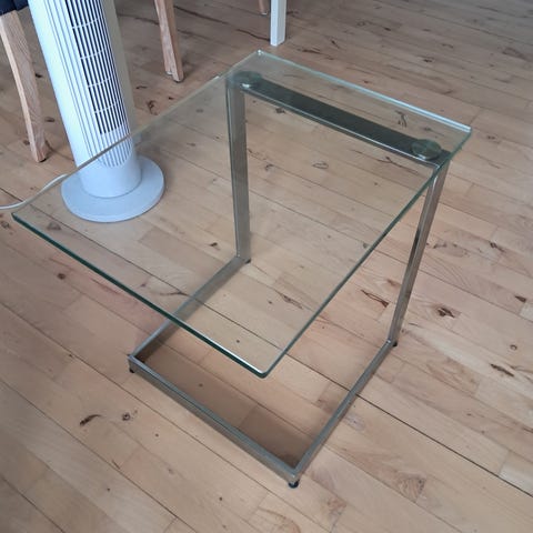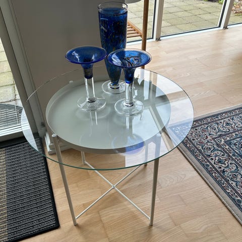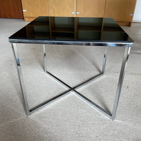 Lille kvadratisk glasbord med sort ramme. Det er kun det lille bord som sælges. Det er aldrig brugt eller samlet. Har stået i kassen siden det blev købt.