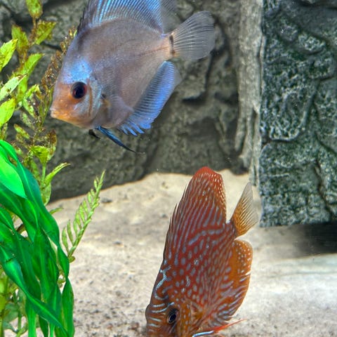 Helt suverent flotte diskus. Ca 16 og 14 cm. Spiser godt og har aldrig haft sygdomstegn. Mit akvarie er ved at være for småt.