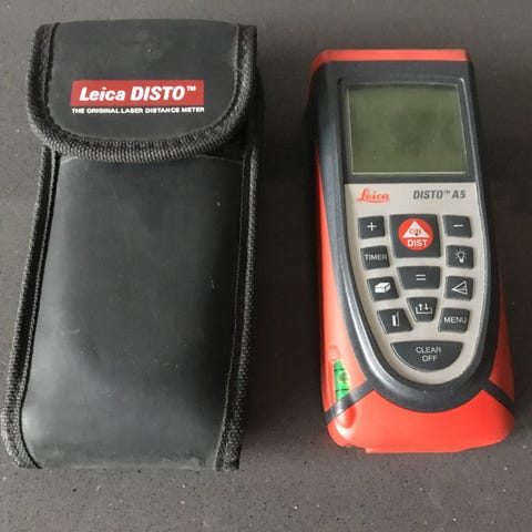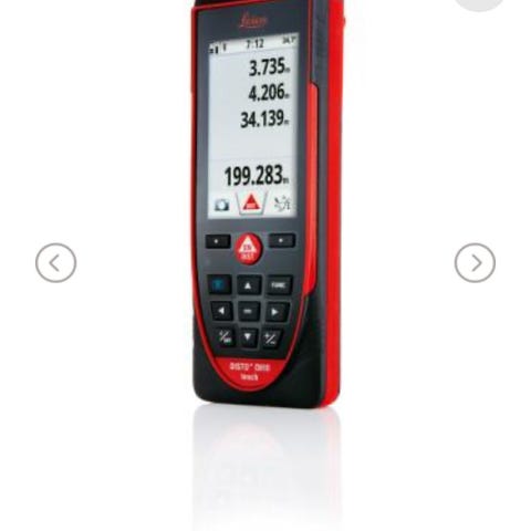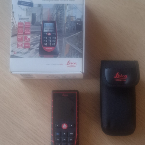 Leica DISTO D2 Laserafstandsmåler med digital display og flere funktioner til præcis afstandsmåling. Enheden har knapper til forskellige måleindstillinger og advarselsmærkater for sikker brug. Designet til professionel og privat brug, kompakt og bærbar.