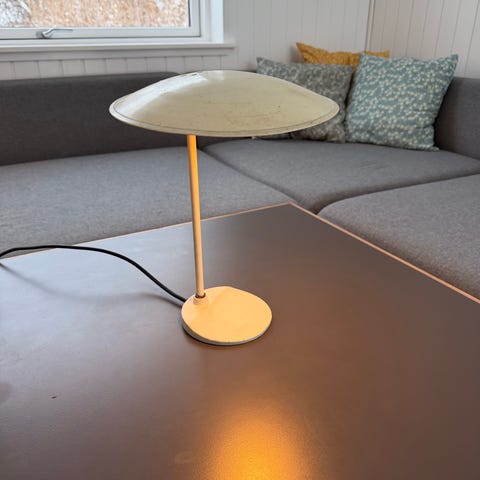 Denne fede bordlampe står flot i varm orange. Den er i bedste bauhaus-stil og er pæn stand, dog med pæn patina efter mange års brug. Den har knækarm, så lyset kan vinkles og afbryder på fod. Skærmen er i hård plast. Måler H: 34cm som positioneret på billede og skærm har Ø: 15cm
