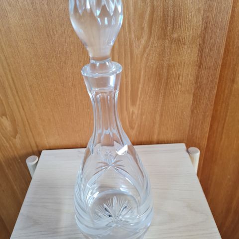 Fin lille håndlavet, norsk krystal karaffel i kuvertstørrelse (ca. 18 cm høj m/ prop) samt to fine dramglas. Både karaffel og glas er i fin stand.