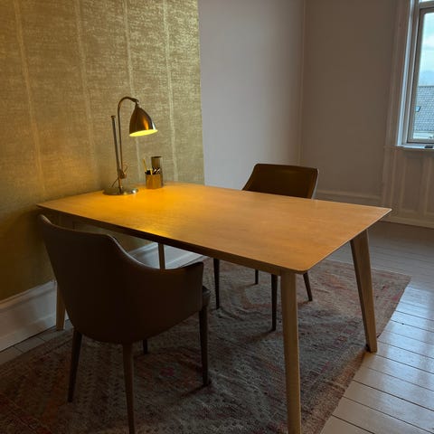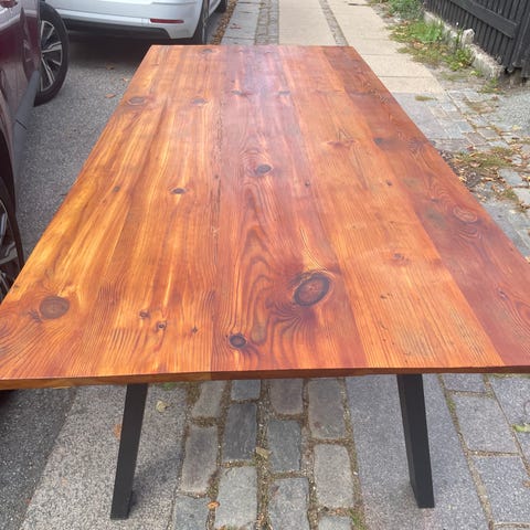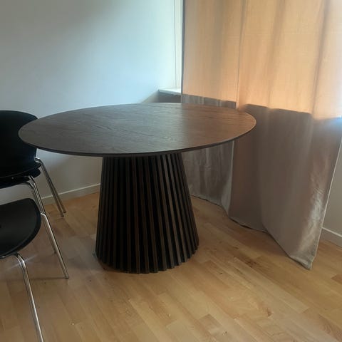 Flot massivt bord i hårdttræ med markante åre. Tappet sammen. Utroligt lækkert og som nyt. Plads til 6-8 omkring bordet. Købt i Ikea for 5100 sælges nu utroligt billigt for kun 2500 Det er en stor besparelse for så flot et bord der kun er ca 1 år gammelt