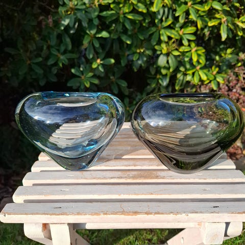 Flot Akva Menuet hjertevase fra Holmegaard - den store udgave. Design af Per Lütken. Højde 11 cm, bredde (hvor størst) 15 cm. Signeret i bunden: Holmegaard, 1959. I fin stand. Kan sendes på købers regning.