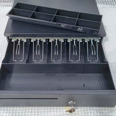 Helt ny kontantkasse / pengeskuffe / kasseskuffe - International Cash Drawer Ltd. 3S-423. 4 rum til sedler og 8 til mønter. Kan åbnes manuelt med nøgle eller elektronisk via kabel. 2 nøgler medfølger. https://cash-drawers.com/index.php/electric-drawers/3s-423-cash-drawer/
