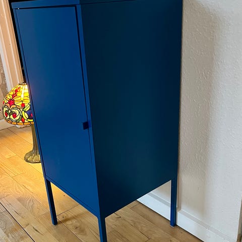IKEA Bent Karlby skab med fire låger med låse i hvid farve. Skabet har flere hylder til opbevaring og er designet med ventilationsåbninger på lågerne. Velegnet til opbevaring i hjemmet eller kontormiljøer.
