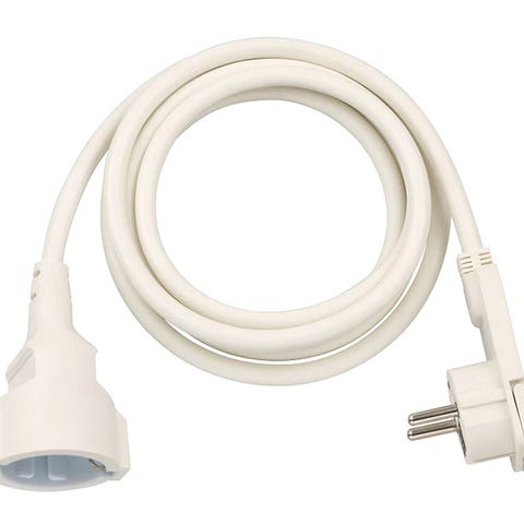 230V Schuko strøm forlængerkabel | hvid | 230V forlængerledning med flad vinkelstikprop. Den flade og vinklede form gør den ideel til trange rum, hvor pladsen er begrænset bag apparater.