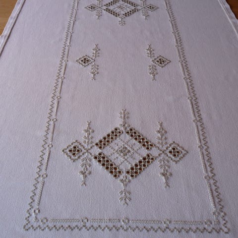En ældre hvid dug i bomuld, med indvævet mønster og blå borter, med blade.