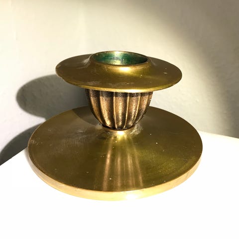 Smuk og hel enkel lysestage af massiv bronze. Fremstår med lidt alderspatina. Passer til alm. størrelse lys. Trods størrelsen vejer den næsten 400 gram. Det er kram og kvalitet. Højde 5 cm. Fodens diameter 4,5 cm. Kr 450,-
