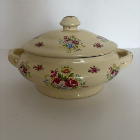 Produktet er en skål med låg i porcelæn, dekoreret med blå blomster og bølger.,Afhentes i:,Røde Kors Kolding (621),Bemærk at mail, chat og beskeder ikke besvares, og varen skal købes på knappen "Gå til varen"