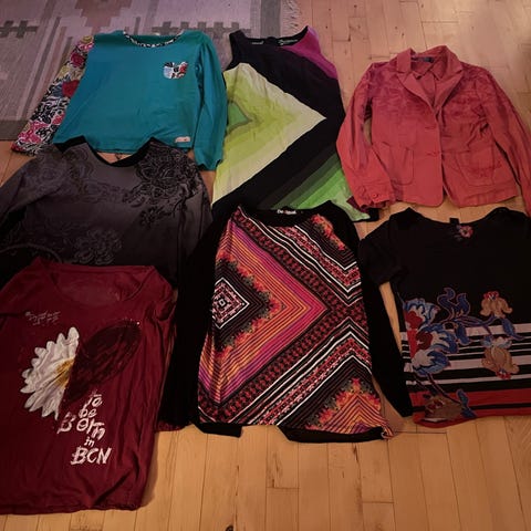Jeg sælger 45 stykker tøj str L, for ialt 150 kroner. Der er blandt andet; kjoler, nederdele, jeans, bukser, bluser og jakker. Der er også noget "Desigual" imellem, og alt tøjet er i pæn stand 👌