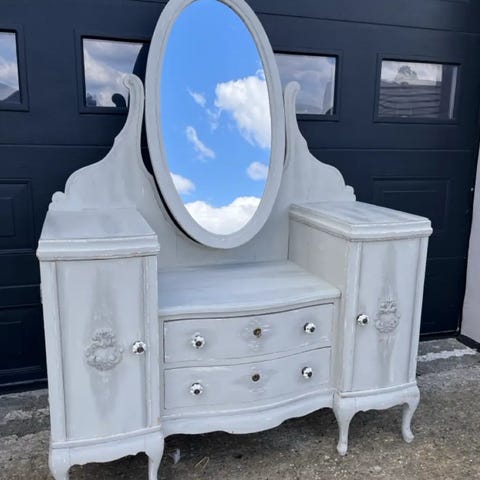 Mulighed for tilkøb af fransk Louis XVI stol i solid valnød med sæde og ryg af flet, som passer til toiletbordet. Se billeder.