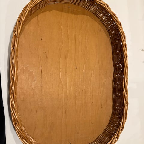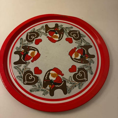 Gammel hyggelig retro serverings bakke med nisser julepynt brugt med patina, bakkens størrelse ca 40x28cm. SENDER mod betaling af porto