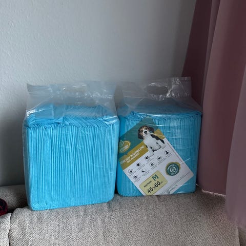 Har to uåbne pakker med absorberende underlag og en åben med 4 stks.