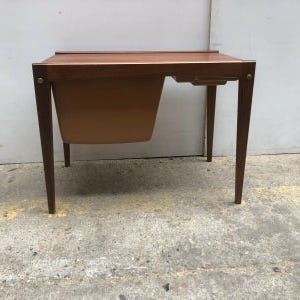 Mindre sybord i teaktræ,med skuffe,hylde og rum under skuffe,skydebar plade.