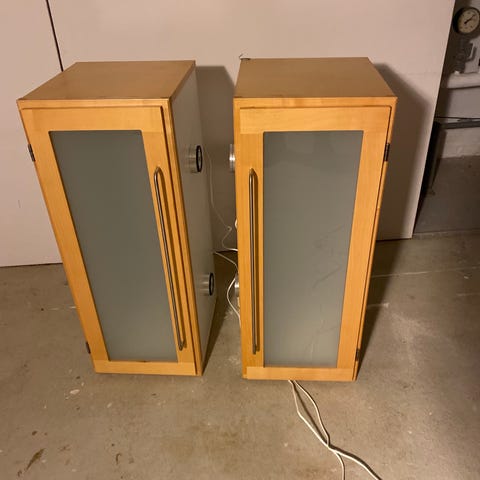 Mobilt multimøbel i den klassiske uno form serie. Fronter i lamel med Sno White laminat. 2 skuffer med udtræk til den ene side. Bordplade i massiv eg med gennemgående stave.