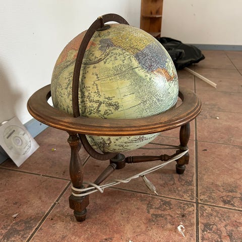 Vintage Globus Jordklode globus med en fin rund mahogni-træfod. Globussen er mærket ‘Tower Globus’ og har en klassisk udformning med geografiske detaljer over kontinenter og oceaner. Materialet på globussen er papir og træ, og den er velegnet som dekoration. Fra ca. 1950’erne. Den har et par slid-mærker.