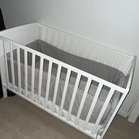 IKEA Tremmeseng børneseng i hvid med tremmesider og integrerede opbevaringsskuffer under sengen. Sengen er designet til børn og har en praktisk opbevaringsløsning, der hjælper med at holde orden i børneværelset.