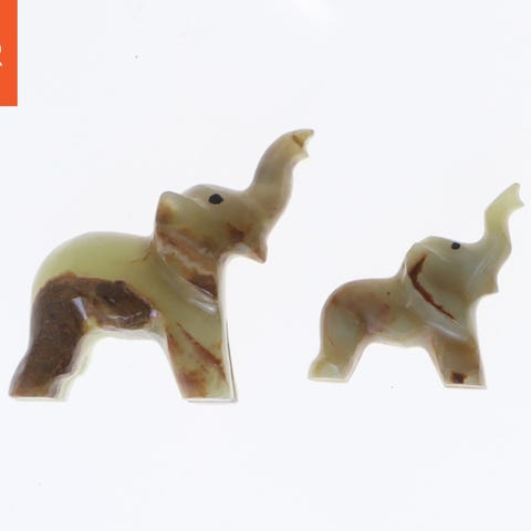 Fire små figurer af elefanter lavet af sten i varierede farver. Elefanterne har indviklede udskæringer og er af forskellig størrelse, fra 6 cm til 4 cm i højde. Den primære farve er beige/gul sten med én af figurerne i en brunlig nuance. Disse dekorative elefanter kan bruges som bord- eller hyldepynt og vil tilføje en etnisk og naturlig atmosfære til hjemmet.