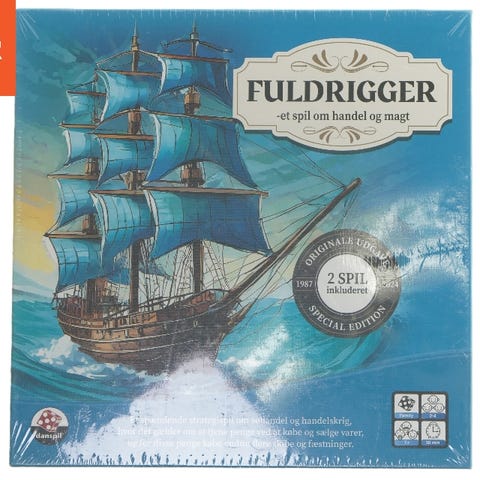 Brætspillet 'Fuldigger' er et strategispil om søhandel og handelskrig. Spillet inkluderer en spilleplade, brikker, pengesedler, kort og instruktioner. Det er designet til 2-4 deltagere, og anbefales til aldersgruppen 7 år og opefter. Emballagen viser et farverigt billede af et skib og et kort over verdenen med forskellige handelsruter.
