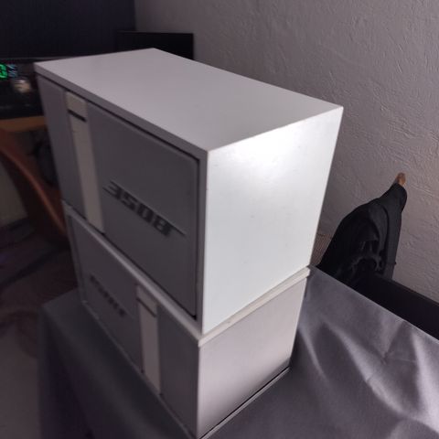 Sælger et par klassiske Bose Model 101 højttalere i den ikoniske hvide/cremefarvede udgave. Disse højttalere er kendt for deres kompakte størrelse og klare, velafbalancerede lyd, hvilket gør dem ideelle til både baggrundsmusik, som surround-højttalere eller i et mindre stereo-setup.