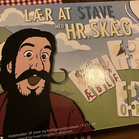 Mini Stavespil Hr Skæg brætspil til sprogindlæring på dansk. Spillet indeholder puslespilsbrikker med tal og billeder, der hjælper med stavning og ordforståelse.