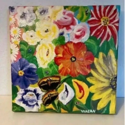 Maleri med tusindfryd og sommerfugle i sort ramme