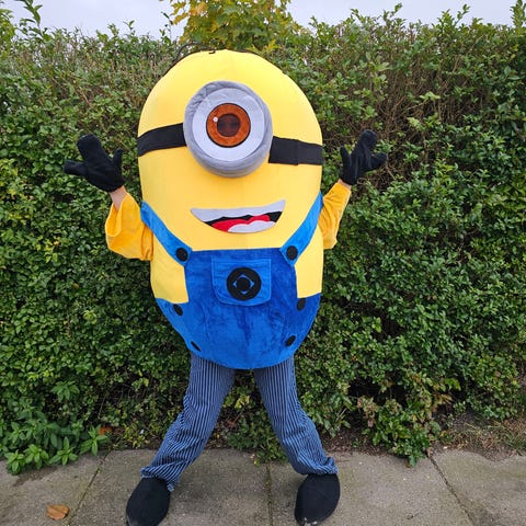 Kostumet inkluderer ben som giver illusionen af at brugeren sidder på skuldrene af Trump og dominere præsidenten.