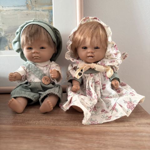Kasse med dukker købt i Sverige. Porcelæn, hjemmesyet tøj. Ikke mærke.