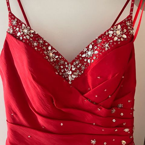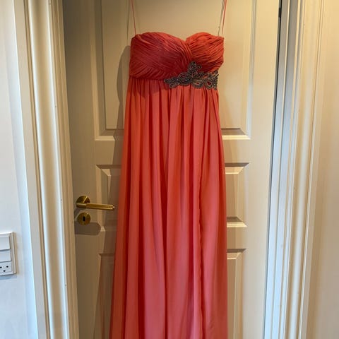 Der er 2 hægter i nakken, så den kan justeres. Den sidder rigtigt pænt med draperingen fra brystet og til midt på låret. Sjal medfølger.