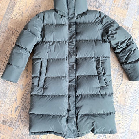Leveté dun jakke i størrelse S. Jakken er oliven grøn og 3/4 lang. Går til lige over knæet. Den har lynlås og knaplukning samt lommer.