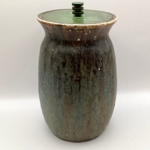 Lågkrukken er fremstår med originalt låg i stentøj. Emnet er dekoreret med heldækkende matsort ler-/askeglasur, karakteristisk for de tidlige Nordströmemner fra Royal Copenhagen.