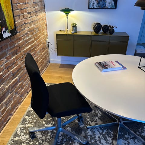 Stolen har justerbar højde og ergonomisk design til brug ved skrivebord eller kontorarbejde.