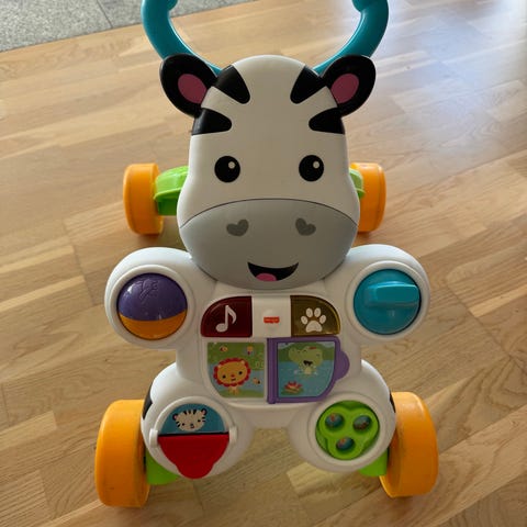 Fisher-Price Zebra gåvogn med aktivitetsfunktioner og musik. Gåvognen har en zebraformet front med forskellige knapper og drejehjul i flere farver. Den har et blåt håndtag, grøn krop og orange hjul. Designet til små børn til at støtte gangtræning og motorisk udvikling.
