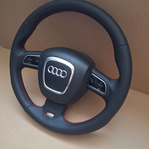 Audi flatbund rat med sprit ny kvalitet perforeret læder og rød syninger (RS-look) meget flot stand, rat med airbag. original rat med sprit ny læder (ikke kina kopi) ! Pris 5000kr fast pris, TAK