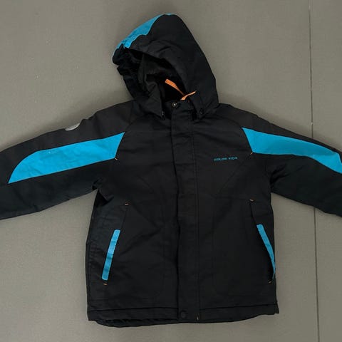 Den har ingen pletter eller huller, men der er brugsspor som velcroen ved ærmerne der er lidt slidt og der er skrevet navn inden i .