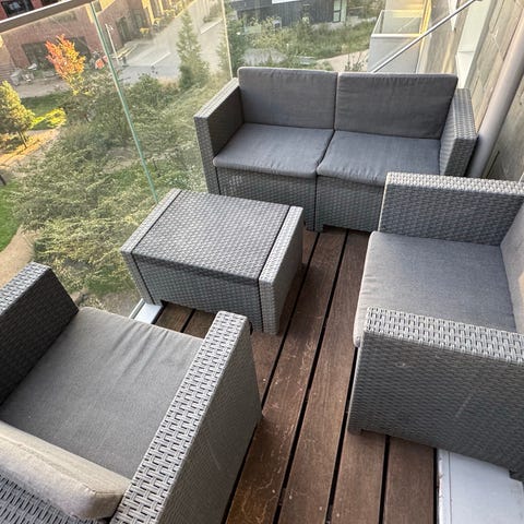 sælges pga. flytning. Flot loungesæt 2.person sofa 2 stole samt bord. Kun få måneder gammel.
