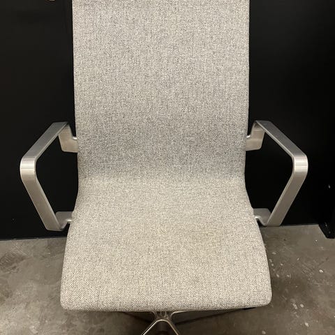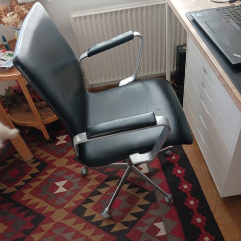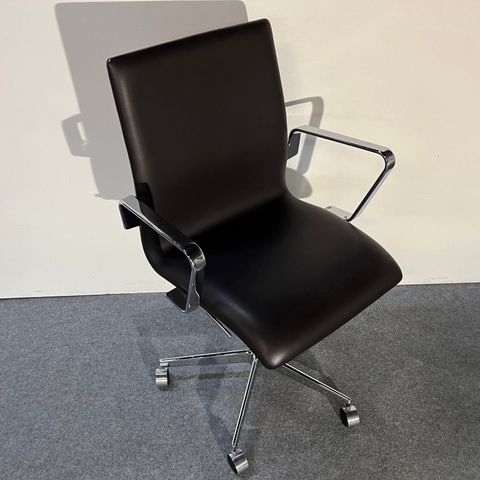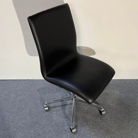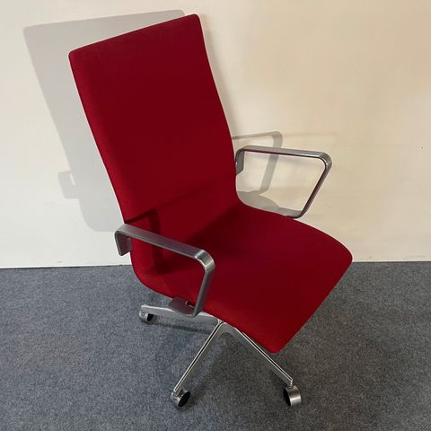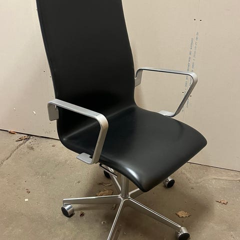 Pæn Arne Jacobsen Oxford stol m. høj ryg og armlæn. Sort tekstil på sæde og armlæn. Fempasfod med returdrej. Glidesko og/eller kontorhjul medfølger. Stand 7/10