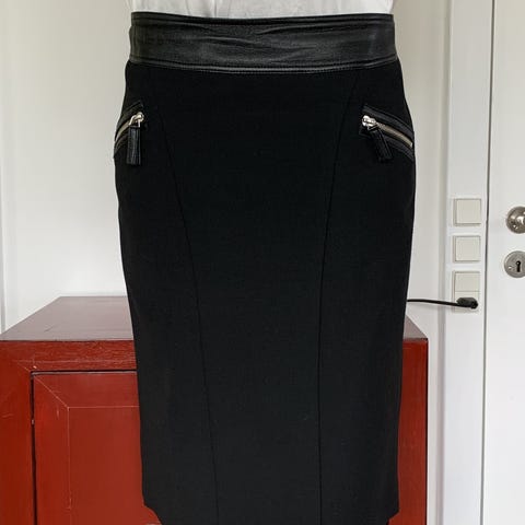 Gerard Darel nederdel i størrelse 46 og et taljemål på cirka 94 cm en længde på cirka 65 cm og en lynlås i venstre side på cirka 17 cm. Nederdelen er hvid med et gråt blomsterprint og er fremstillet af 72% bomuld, 28% silke med 100% bomuld som for. Knappen i linningen i venstre side af nederdelen er kun til pynt.