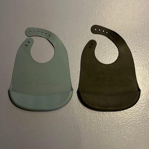 Cam Cam Copenhagen hagesmækkene er i en lækker silikone kvalitet og lukkes i nakken, hvor de kan justeres i længden. I bunden er der en spildlomme, der opsamler mad.