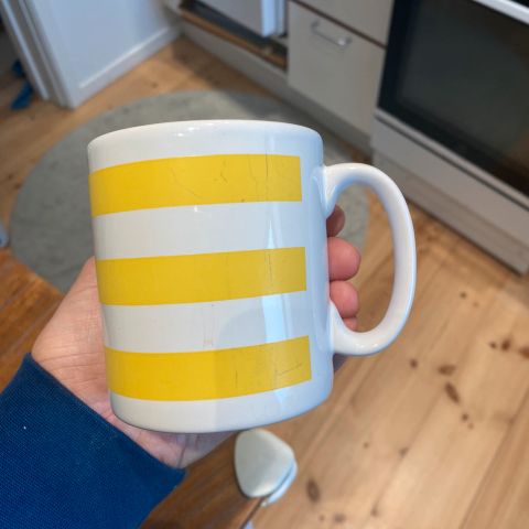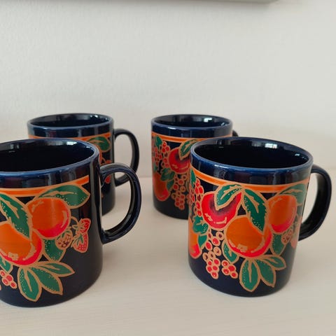 Jeg har gennemgået kopperne og har ikke kunnet finde nogen skår eller afslag. En af de store har krakeleringer i bunden, og en sf de små er født med fire bittesmå ujævnheder i glasuren på ydersiden.