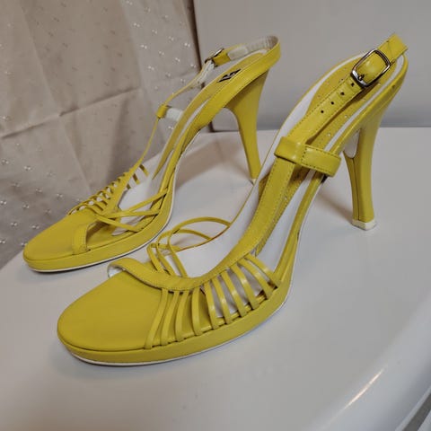 Jeg giver disse fine høje hæle/sandaler væk – i nude og sort, størrelse 41. Brugte, men i fint nok stand.