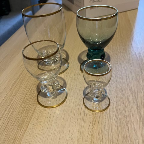 Alle glas i god stand med guldkant og uden skår. Har aldrig været i opvaskemaskine.