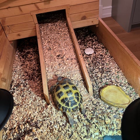 Udendørsanlægget har vi selv bygget, og består af en udendørsgård med hønsenet i låget samt et indendørs hus, som er isoleret og har medfølgende varme- og UV-lamper. Huset kan lukkes, så de ikke kan kravle ud, og temparaturen kan kontrolleres. Der er tagpap på taget, så huset er helt tæt. Undendørsgården måler ca. 186*105*42 og selve "huset" måler ca. 110*80*93.