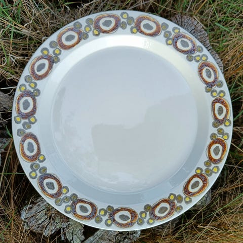 Royal Copenhagen Aluminia Nucella Fajance service sæt bestående af tallerkener og kopper. Sættet inkluderer middagstallerkener, frokosttallerkener og dybe tallerkener med en dekorativ brun og gul mønsterkant, samt matchende kopper med hank. Fremstillet i fajance porcelæn med et unikt mønster. Velegnet til daglig brug eller samling.